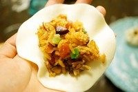 6. 将买来的饺子皮四周擀薄,放一坨糯米饭用虎口将边边捏出褶子。