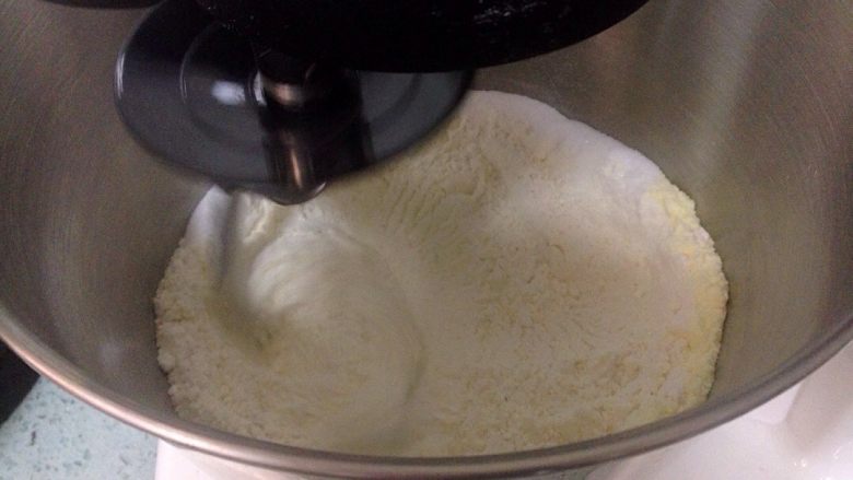 2. 材料搅拌均匀后,缓缓倒入椰浆,中速揉面20分钟。