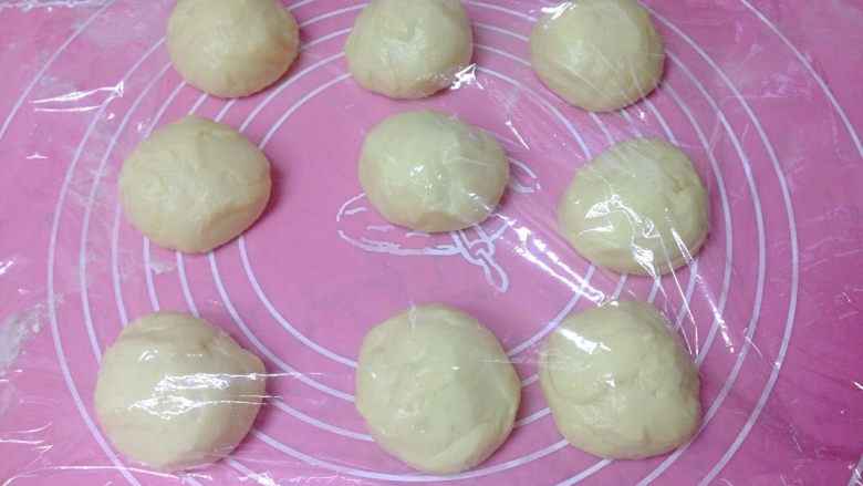 7. 发好的面团按压排气后,分成9等份,盖上保鲜膜松弛10分钟。