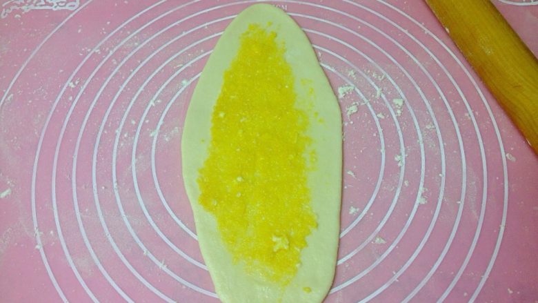 8. 取一个小面团,擀成椭圆形面皮。