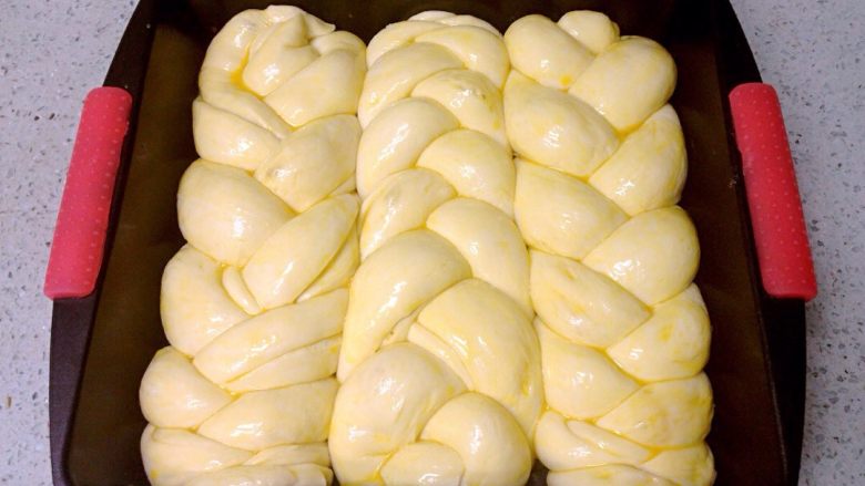 12. 编织好的3根粗辫子排入模具,进行二次发酵。