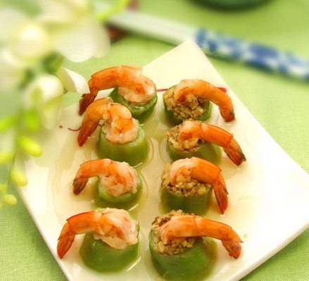 6. 最后在所有丝瓜盅上倒着插入虾仁,水开入蒸锅,蒸6——8分钟即可。
