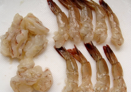 2. 八只大虾去头,去虾线,留尾部的壳备用。另外几只剁成虾泥。