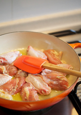 2. 锅内中高火预热植物油,将鸡肉表面水分擦干后皮面向下入锅煎至略带焦糖色,盛出待用。此时预热烤箱150摄氏度