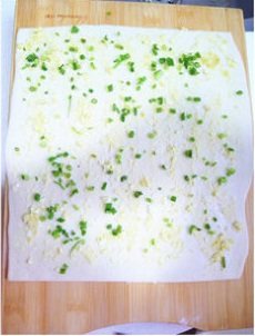 6. 擀成厚薄均匀的面饼,撒上一层蛋黄粒及小葱粒;