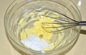 1. 室温下软化后的黄油搅打顺滑,加入细砂糖和盐继续搅打至顺滑蓬松