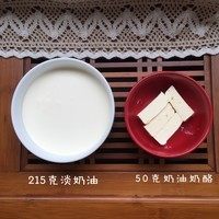 2. 倒入一小部分淡奶油进锅里,放入所有奶油奶酪,隔水加热至融化。有人说奶油奶酪融化不了,你可以用打蛋机戳戳它呀,是可以融化的。