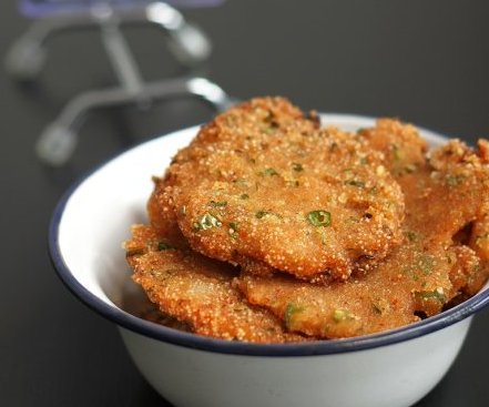 7. 锅中放油,中火,用勺子将米糊舀一勺下锅,用勺背略压扁;