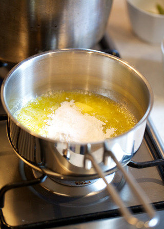3. 放入面粉并缓慢、充分搅拌。略翻炒一会儿,至面粉没有干粉快,混合物呈金黄色小团。这一步制成的黄油面团结块称为roux,在制作浓汤的时候可当作增稠剂,可令浓汤拥有更加豪华的口感