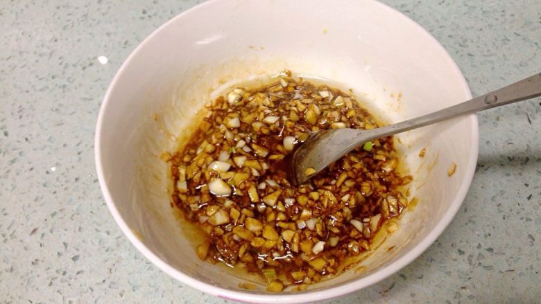 4. 蒜头、生姜剁碎,加适量生抽、食用油,混合均匀成蒜蓉蘸料。