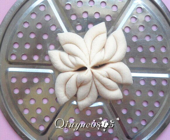 做这个类似菊花的花样馒头,花朵盛开的大小是由你弄的花团圈数决定的。我试了一下,花团圈圈太多了,花不美,有点憨;花团圈圈太少了,蒸出来效果却出不来。自我感觉有三四圈最适宜。另外可用蔬菜汁和面,弄成彩色花朵,非常好看。