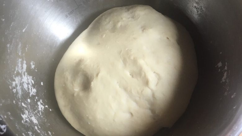 1. 面粉加入糖、干酵母、温水250ml揉开,揉至不粘手、不粘锅为妙。放置发酵4小时(发酵至面团有孔)