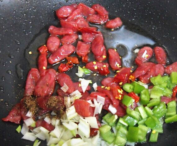 5. 放葱姜、花椒、辣椒等炒出香味。