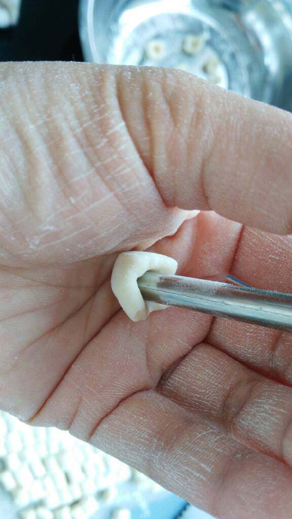 9. 切好后撒些面粉防粘,取一个面丁放在左手的手掌心上,右手拿一根筷子,筷子头沾些面粉(用筷子的粗头)顶住面丁的中心,轻轻的揉转成酒窝状