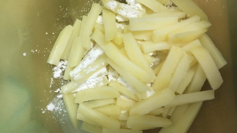 5. 然后给锅里放油,等油烧热以后,把土豆条放进去,炸成金黄色捞出。