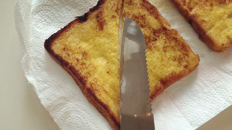 8. 将吐司每面煎2-3分钟,至吐司两面呈金黄色