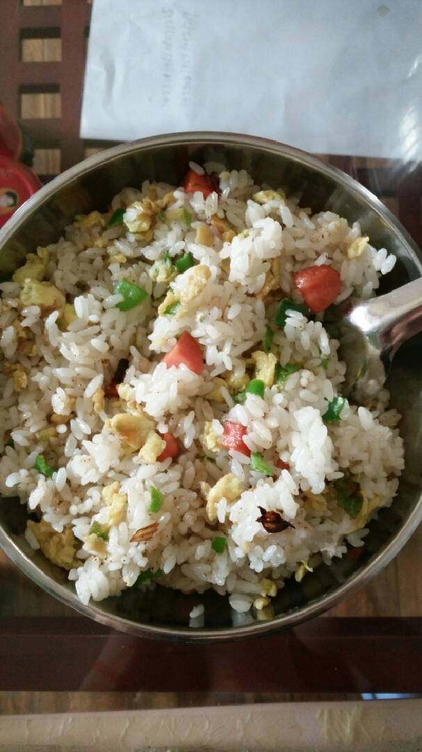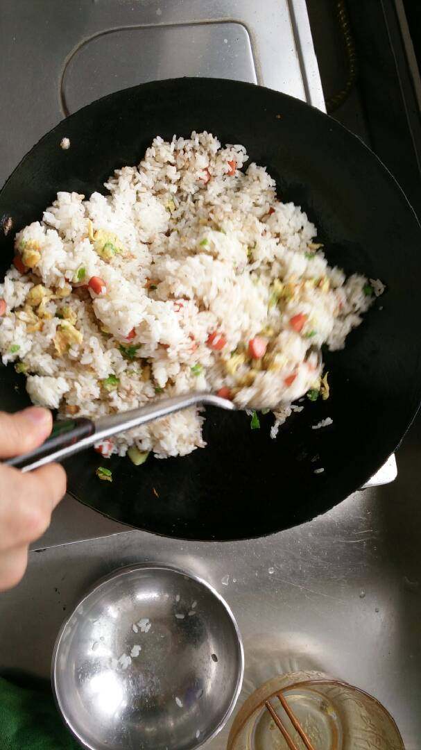 4. 待青椒鸡蛋快熟时,倒入切好的火腿丁翻炒