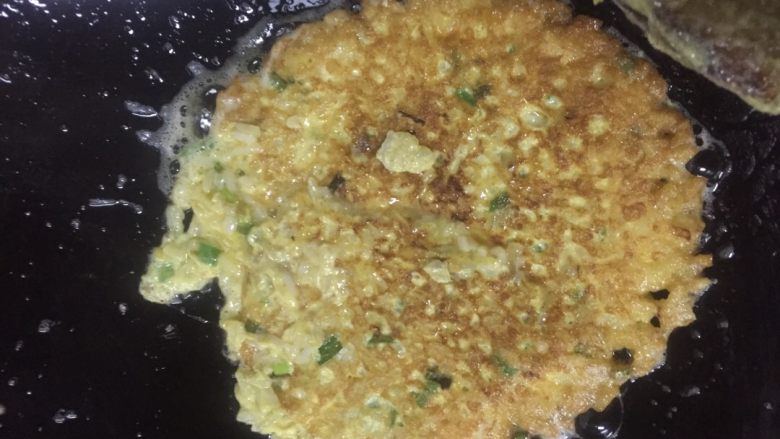 5. 热油放蛋浆,先把一面煎黄再翻另外一面