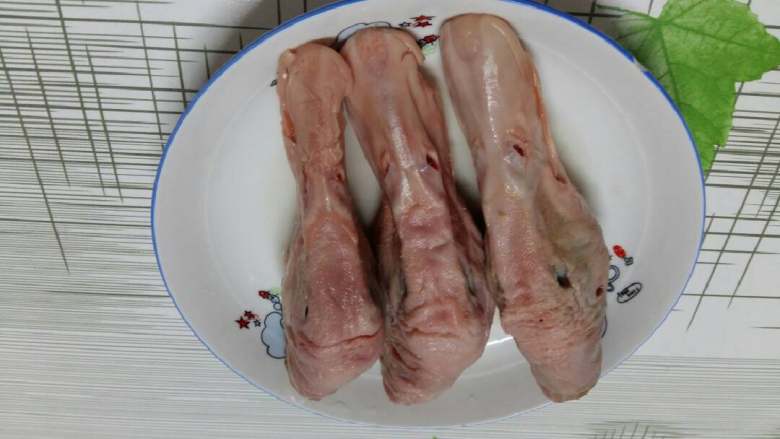 3. 焯熟的鸭头清洗干净,生姜切片,桂皮,八角,香叶,辣椒干,葱段备用。