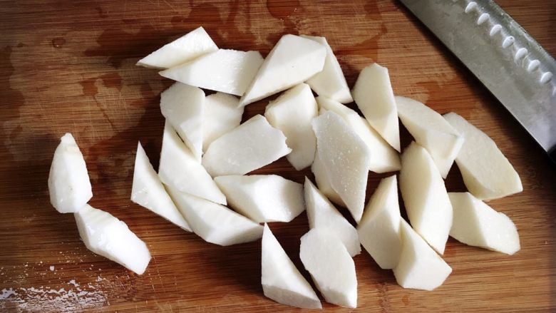 5. 山药去皮。滚刀切块后放入炖煮的乌骨鸡汤种。小火继续煮15-20分钟。