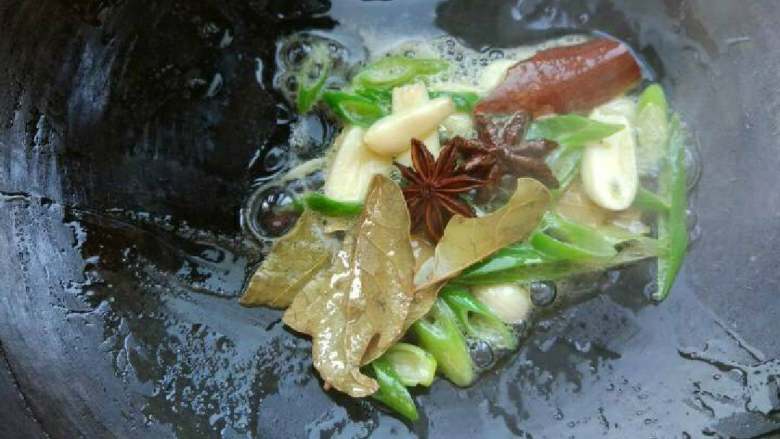 4. 热锅热油,爆香,葱,蒜,八角,香叶,桂皮
