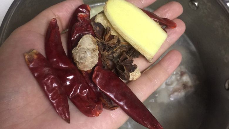 3. 然后锅里放水!把猪脚倒入锅中!并放入少量盐,加入干辣椒,八角,山奈,生姜。盖上锅盖中火煮40分钟左右!