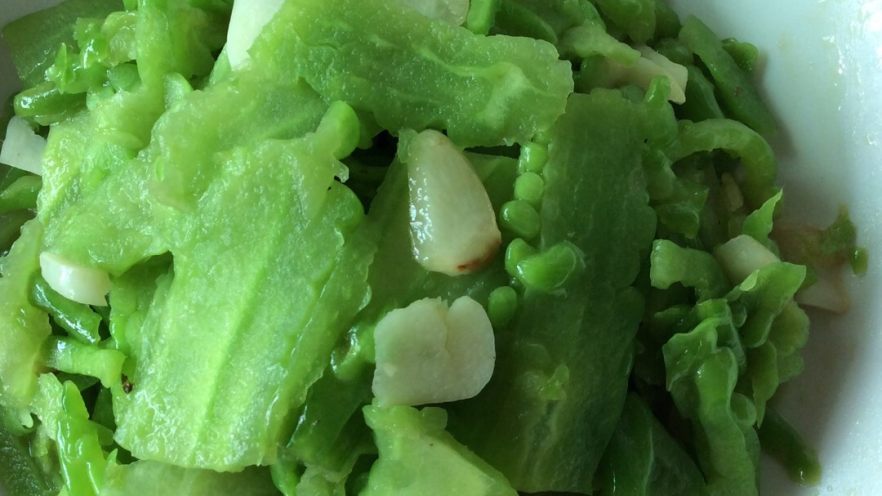 7. 加入苦瓜片翻炒均匀即可出锅,不要炒的时候太长变色就不脆了