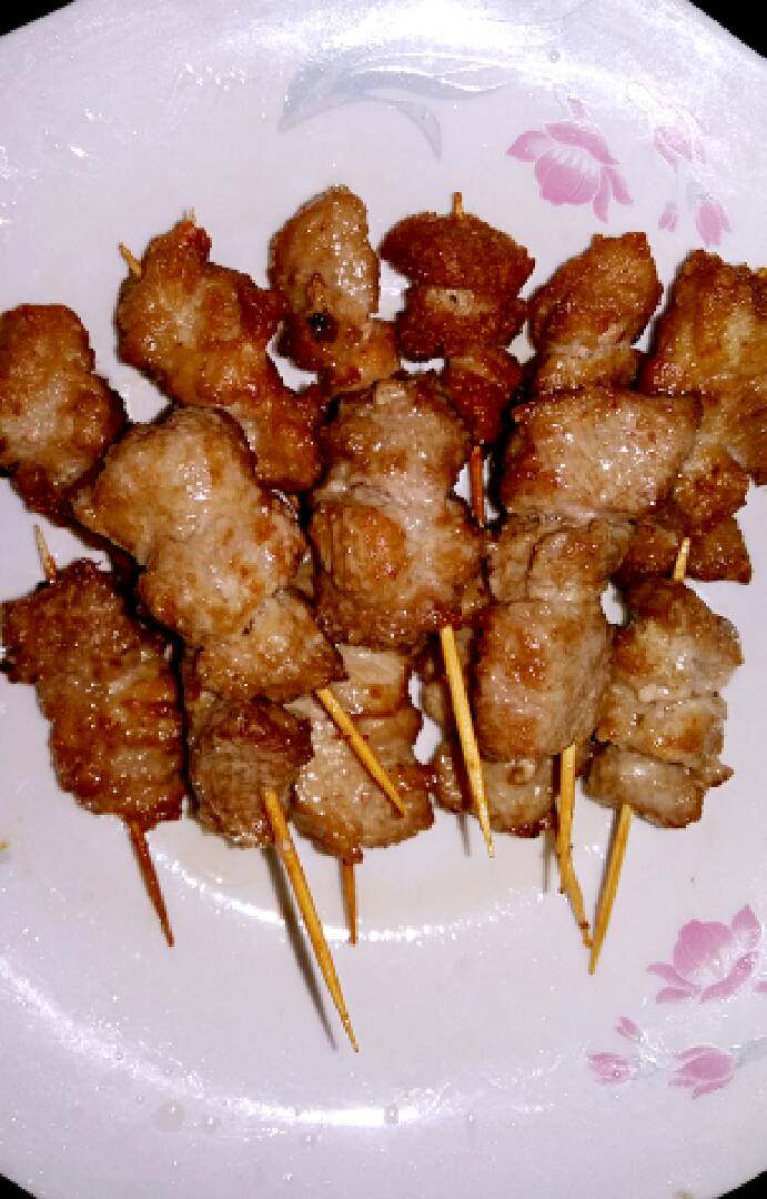 5. 锅烧热倒入油,中小火投入里脊串慢慢翻炒,见微黄色即可。