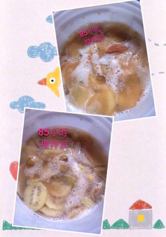 6. 12小时后每天搅拌2-3次,酵素桶表面起了一些泡泡,把浮在表层的食材轻轻用搅拌勺往下按,让食材充分浸泡在液体当中,使之发酵更加充分
