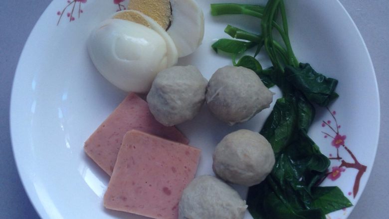 1. 鸡蛋煮熟,切片。菜叶,鱼丸,午餐肉煮熟备用!