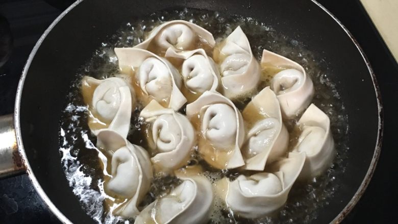 4. 把汁淹于饺子的一半,大火烧开转小火继续煎。