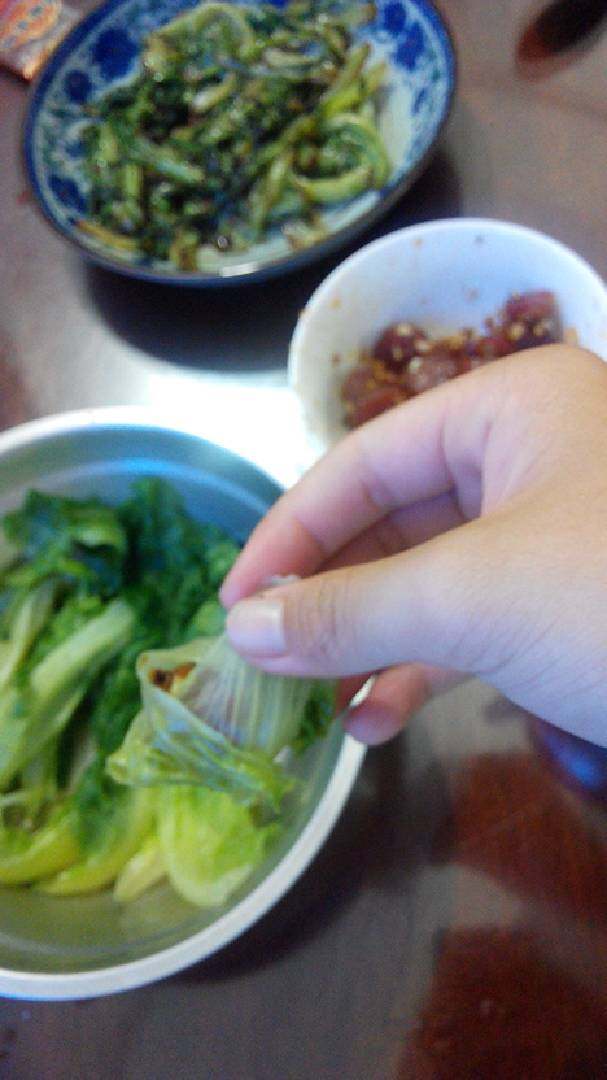 7. 然后拿起一片菜叶加两块腊肠包起来,沾点番茄酱,吃起来非常美味,如果再炒腊肠时用多余油,如果你有剩菜可以炒来吃哦,在加点酱油,更加美味
