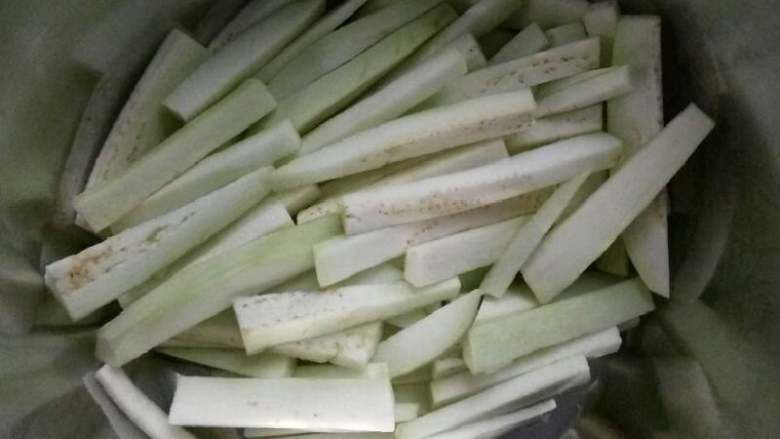 3. 植物油加热后放入茄条炸软即可,不需要金黄色。