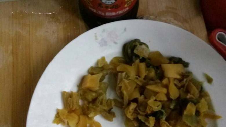 4. 先倒入油加热后入生姜煸炒出香味~依次放入酸菜~炸好的茄子条~略煸炒后放入老干妈~喜欢盐味重的可以放点盐,略加水,以防沾锅,快炒2分钟。