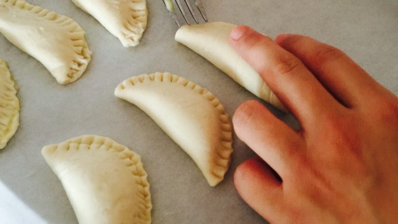 6. 然后用叉子均匀的压在边缘,形成榴莲酥特殊的褶子