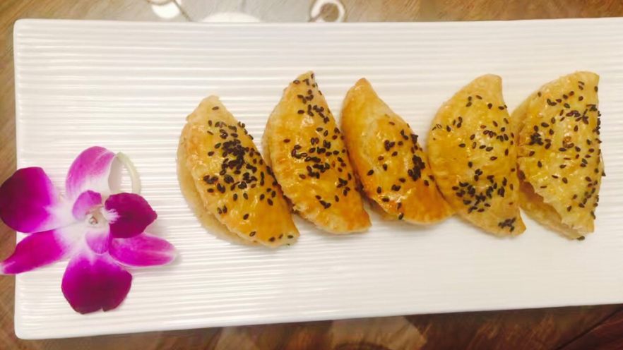 5. 像包饺子一样,把馅放入饼皮,轻轻粘合饼皮即可(记住不需要粘褶子)