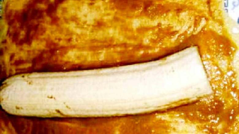 6. 摊开加入红枣泥抹开,放入香蕉片,红枣泥的卷饼非常好吃。