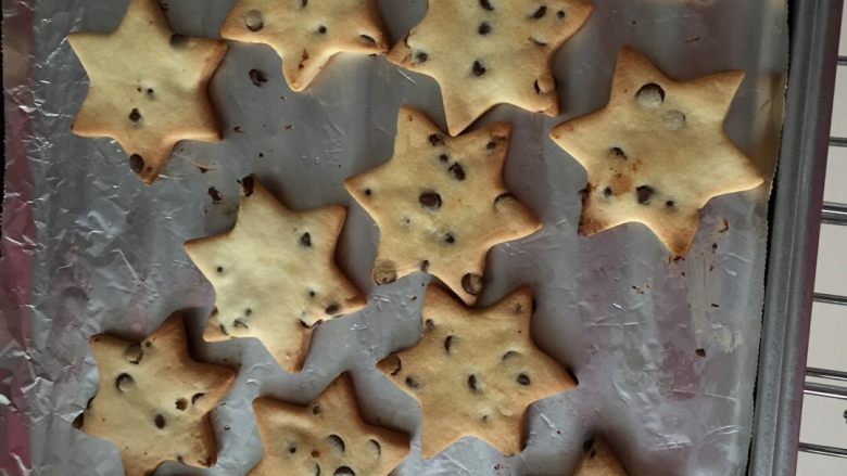 7. 面团拿出来后加巧克力豆或葡萄干搓软,用擀面杖擀成薄片,用模型压制饼干