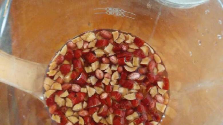 4. 泡大概一个小时就行了,等不及三四十分钟也可以,然后连同泡的水一起倒入豆浆机中