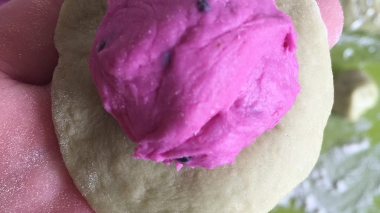 7. 当当当!出炉!切开,发现火龙果馅因为水汽的原因变成了暗红,试验对照的依旧是红色,结果不是很满意。以后再想办法改进~味道赞就OK啦!建议外皮可以用蔬菜汁,这样外皮绿,更像西瓜哦!