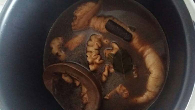 3. 放入老抽调色,盐,跟冰糖少许调味。高压锅压10分钟