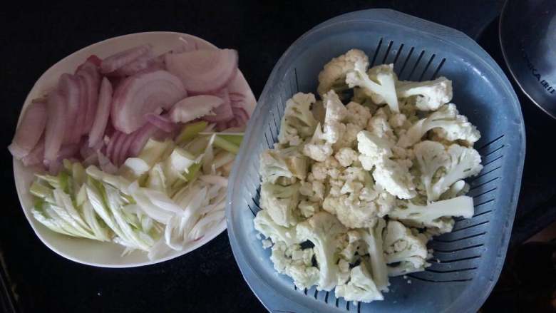 6. 干椒、蒜米、姜片切好待用。热锅下油放入蒜米,姜片炒出香味后放入2茶匙豆瓣酱,炒出香味后放入干椒、菜花、洋葱、大葱炒软。期间放入少许盐