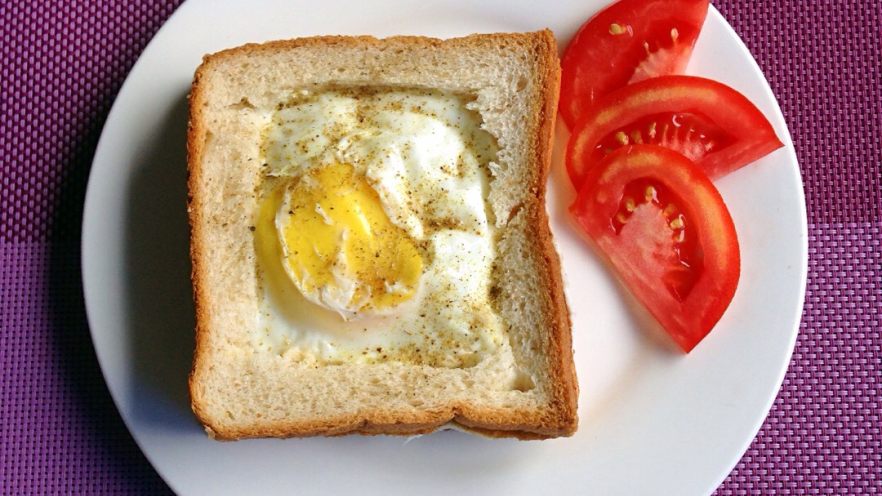 6. 两片吐司从叠,在面上撒胡椒粉和盐巴调味即可。提示:可以放几片番茄装饰。