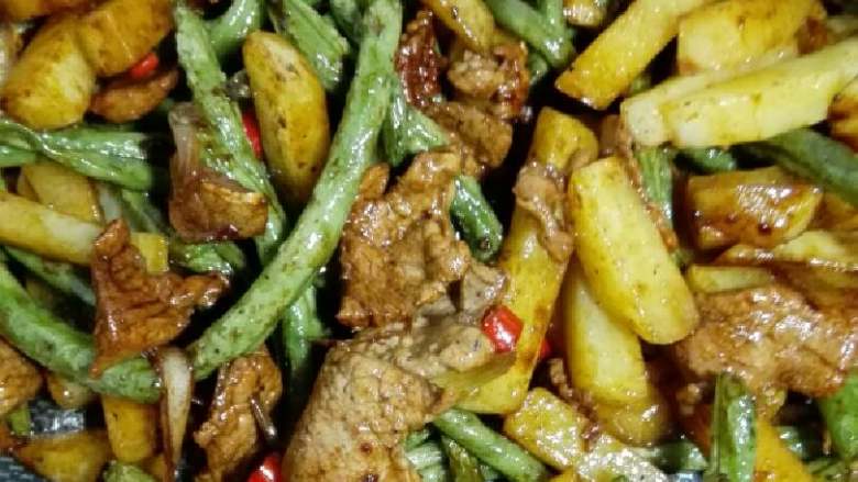 5. 捞出土豆 芸豆留底油辣椒 葱姜蒜炒香后加入肉片炒至变色即可