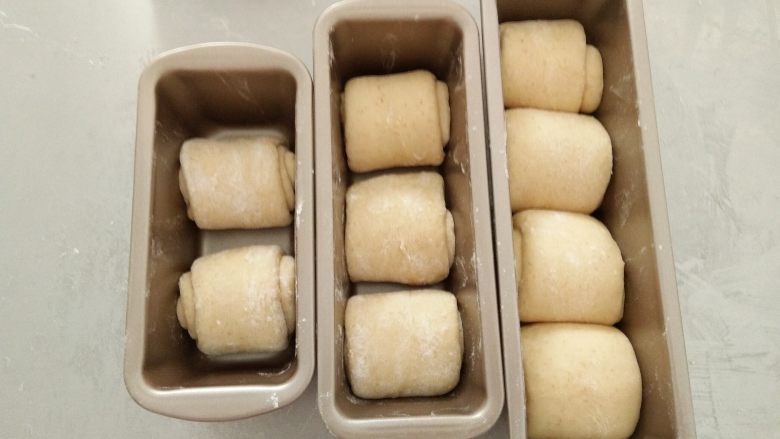 9. 卷好的面团收口朝下,放入模具中进行二次发酵。
