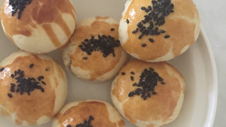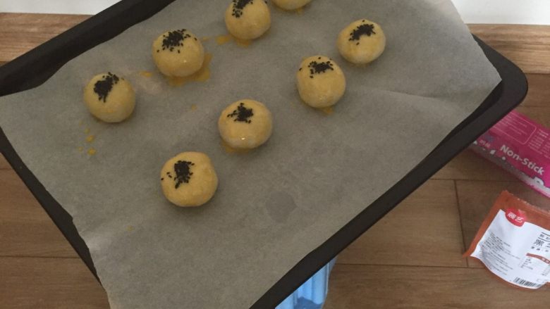 8. 包好的团子放在不沾烤盘上,涂上蛋黄液,中间撒上芝麻,