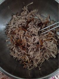 4. 烘干:将拌好的肉丝,在烘箱内中火烘干至15-20%左右水份,外干里韧,Q弹有嚼头!