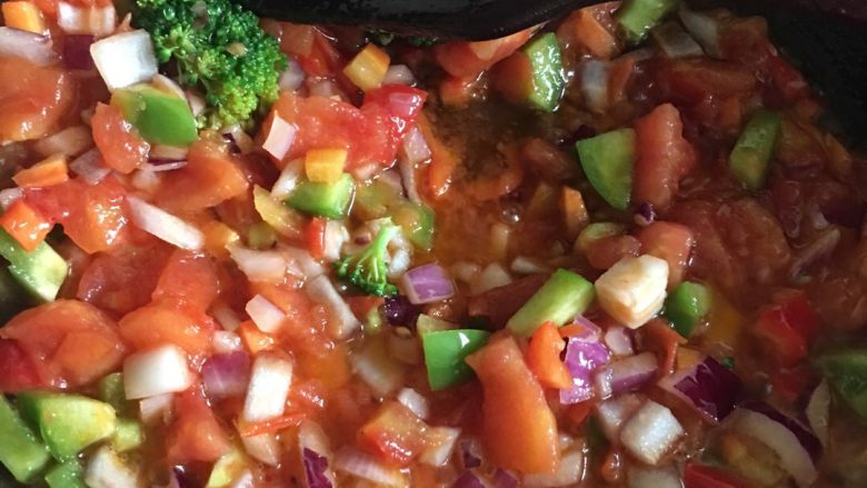 7. 放入西兰花、洋葱、胡萝卜、青椒翻炒,至番茄酱均匀,加适量盐