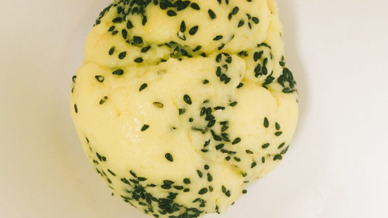 5. 把面团分成两份,一份裹上黑芝麻,最好揉均匀哦,我有点偷懒了,没怎么揉!我这个方子出来的面团基本不粘手的哦,所以我都没有戴手套什么的!