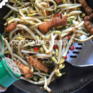 10. 煸炒出香味后加入花生芽,汇进花生芽中火翻炒,加入适量的味极鲜,加入适量的水稍微焖一下 。